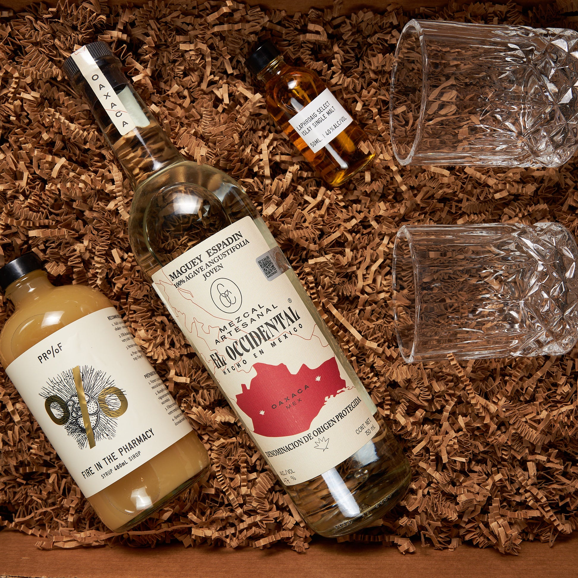 Sombra Mezcal, Honey & Ginger Lemon Cordial, 50ml peated Scotch, 2 Aztec Rocks Glasses.