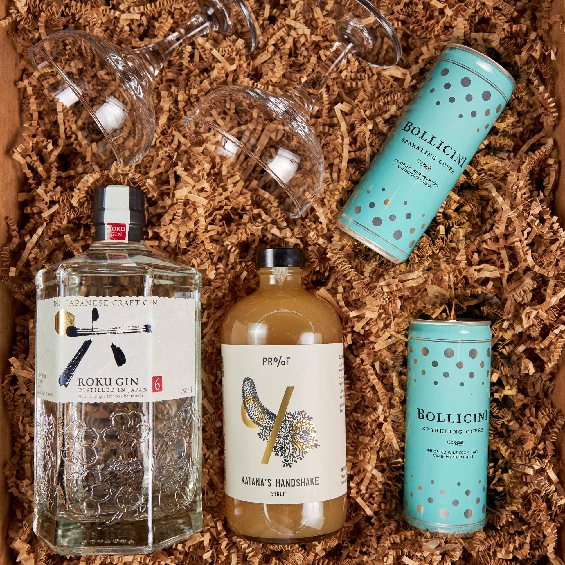Includes 11 serves of acidified lemongrass cordial, a bottle of Roku Gin (750ml) and 2 cans of sparkling Cuvee (250ml), and 2 coupe glasses.