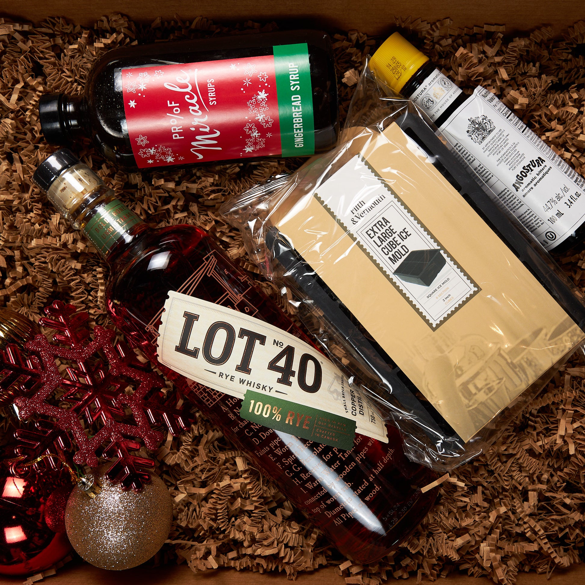 Lot 40 Rye(750ml), Gingerbread syrup, Angostura bitters(100ml), Ice mould, Orange(2)